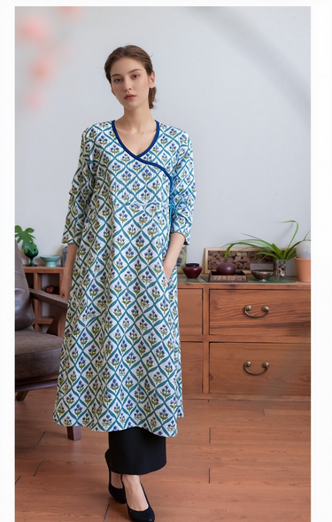 Embrace serene elegance with our Blue & White Sanganeri Block Print Kurta. Artfully crafted from pure cotton, its flattering empire line and graceful overlap neckline offer sophisticated comfort. This below-the-knee, regular-sleeved design with subtle side slits embodies timeless Eastern artistry. Reassuringly authentic and consciously crafted, it’s a mindful expression of your unique style, blending tradition with contemporary grace.