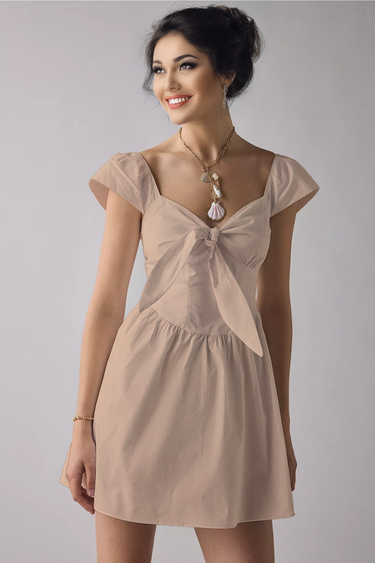 This beige dress features a sophisticated V-neckline with elegant tie-up details, offering a flattering silhouette that enhances your natural shape. Crafted for versatile wear, it balances comfort with style, making it an ideal choice for both casual outings and semi-formal events. Its neutral tone pairs effortlessly with various accessories, ensuring a polished and timeless look.
