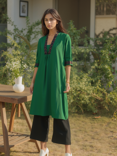 Embrace serene elegance with our Leaf Green Solid Cotton Peplum Kurta. This mindfully crafted piece features a graceful trapeze neckline and charming peplum style, offering a sophisticated, below-the-knee length. Made from pure, breathable cotton, it's a conscious choice for authentic self-expression and enduring style. Feel confidently nurtured in this artistic, collarless design, a true blend of comfort and timeless beauty.