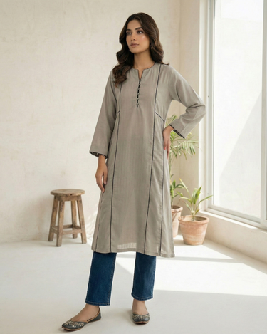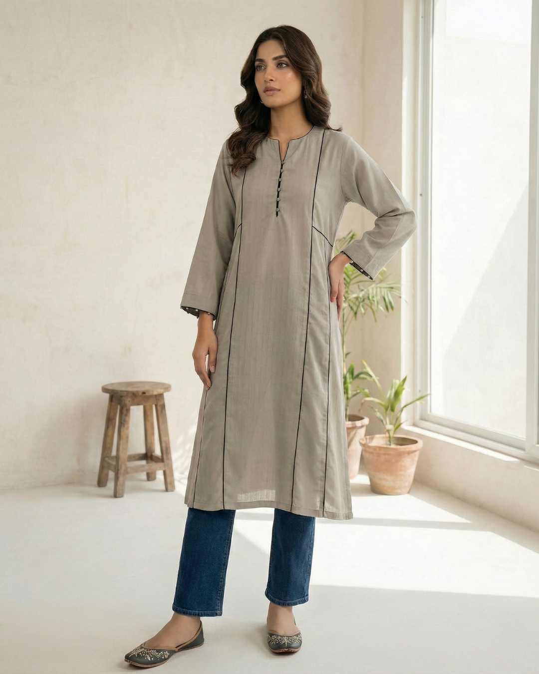 Designed for the woman who appreciates clean aesthetics and subtle detailing, this kurta is a versatile staple for any season. The garment features a sophisticated taupe-grey hue that serves as the perfect neutral canvas. The design is elevated by distinct vertical black piping that runs down the front bodice and sides, creating a sharp, architectural look that visually elongates the silhouette.