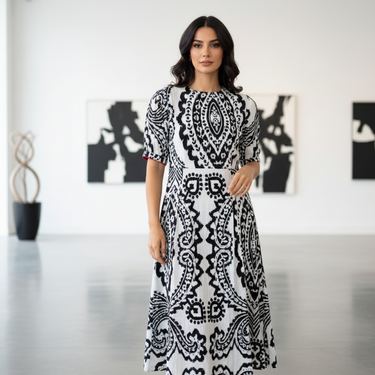 The Digital Rhapsody Midi A contemporary midi dress that merges artistic expression with refined tailoring. This piece features a striking digital-print design that captures movement and rhythm through color and pattern, making it an ideal choice for those who appreciate fashion as wearable art. The midi silhouette offers versatility—equally at home at evening events, creative gatherings, or elevated casual occasions. Crafted with attention to drape and comfort, it pairs seamlessly with minimalist accessories to let the design take center stage.