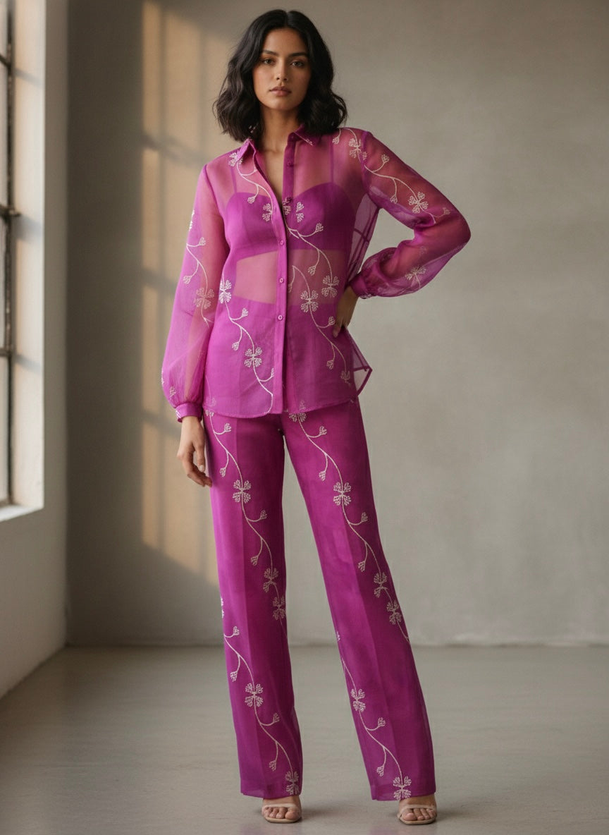 A striking three-piece set featuring a transparent magenta organza shirt adorned with delicate white vine embroidery. The look is grounded by a matching waist-length bustier and high-waisted, straight-leg organza trousers. Blending ethereal transparency with structured tailoring, this ensemble offers a sophisticated, modern take on romantic evening wear.